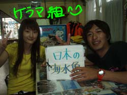 こんにちはぁ☆今日は、まみの高校のお友達ヤナPと可愛い奥様ジュンちゃんが初めての体験ダイビングに来てくれました!!「緊張してる人?」の問いに即答で「ハイッ!!」の2人(笑)いざ、海に入ってもはじめは緊張ガチガチ(^^)でも慣れてくるとカメラにピースしたり、ニモにチューしてもらったり!?ナマコやヒトデで遊んだり、必死なときもあったけど(汗)楽しんでもらえ・・・たよね??海からあがったときに2人ともとってもニコニコで嬉しかったです♪♪また2人に会えるのを楽しみにしてるねー☆★ありがとぉ☆ |