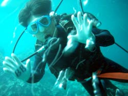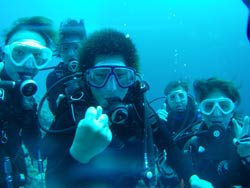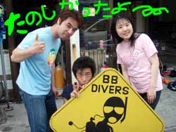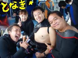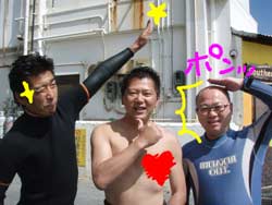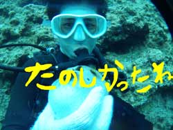 今日は〜体験ダイビング〜!!参加してくれたのは〜りょうさーんでーす!あとは付き添いのライセンスの持ってるしげさーんです!何回か体験ダイビングをやってるそうなので耳抜きとかの練習はバッチリ!ほとんど練習も必要なくもぐることができました!!Bコースだったのですが・・左のドロップまでいってクレパスを通ったり、まるでファンダイビング〜!楽しかったですねー!クマノミの家のイソギンチャクにもお邪魔してきました!ペトペトしてて変な感触だったでしょー!今度はりょうさん!ライセンスコースでお待ちしていますねー!! |