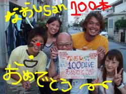 まいど〜ひろあきです!!今日は粟国島&渡名喜へ行ってきました☆まずは粟国は筆ン崎で2ダイブ。一本目は流れもほとんどなくギンガメアジの群れも影も形もなく・・・。でもイソマグロがぼくらの周りをぐるぐると回って大きなロウニンアジも登場してくれました。そして次こそは!!と期待を胸に2ダイブ目エントリー!!すると潜行してすぐに黒い影が・・・。「いた〜〜〜っ」っと心に叫んでそっと近づくと何百匹というギンガメが巨大な岩のようにかたまりぐるぐるトルネードしていました。。これにはみんなも大興奮☆近くには巨大ロウニンアジもぐるぐる回っていました。。エキジット直前にはサンゴの陰に隠れているカメを発見!!でも泳ぎたって流れにぴゅ〜〜って流されてる姿はめちゃめちゃ可愛かったです(笑)それから渡名喜に移動してお昼ご飯を食べてブルーホールでエントリー3本目!!透明度も抜群で暗い穴を抜けると真っ青な光がとっっても綺麗でした。。。そしてなおしの100本記念のお祝い〜〜!!!!!!なおし100ダイブ達成おめでと〜〜〜★☆★☆これからも豪快なジャイアントエントリーでがっつり潜ってね!! |