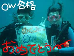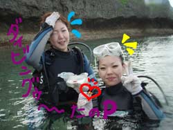 こんにちはー!!今日はなんと!!新たにダイバーの誕生です★今日ダイバーになったのは太田夫妻の紹介できてくれためぐちゃん&あいちゃーん!!おめでとー♪2人共初ダイビングだったので初日はマスククリアやマスク脱着に苦戦しましたがナイスガッツで乗り越えましたー☆最終日は1本目砂辺で少しスキルをやって、2本目は蒼の洞窟のある真栄田岬に行ってきましたー!!洞窟の光に癒されたりたくさんの魚に囲まれて泳ぎまわったり気持ちよかったですねー!!そしてそして最後には水中でOW合格のお祝いもしちゃいましたー!!おめでとー!!次は太田夫妻と4人で一緒に潜りましょーね!!楽しみに待ってまーす☆ |