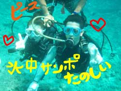 はーい!今日も元気にわんたんでーっす!!今日はビーチで体験ダイビングー!!参加してくれたのは〜おぉぉぉぉーーー!!久し振りのージンさーーんじゃないですかー!!の紹介のマナミさーんです!ちょっとドキドキしていたみたいですけど・・(笑)ゆっくりと練習していたら全然大丈夫でしたね!!真栄田岬でね・・(笑)どうですかー!きれいでしょー!魚もたくさん集まってきて、可愛い魚もわんさか!1人でも最後の方は泳げるようになっていましたね!今度は洞窟コースでおまちしてますねー! |