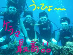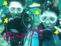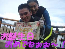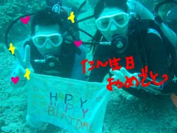 おこんにちわ〜☆心、元気のさんぺーです!今日は大阪から体験ダイビングに来てくれたしんちゃんとかおるちゃんと一緒に楽しいダイビングしてきましたよ〜☆最初は2人ともドキドキしていたけど徐々になれてきてとってもじょうずに泳いでいましたね!!水中でしんちゃんの誕生日のお祝いにハンカチをプレゼントしたときはとっても喜んでくれて僕達も嬉しかったよ〜また沖縄で一緒に潜りたいですね☆これからも仲良く幸せな家庭を築いてくださいね!!次回2人に会える日をスタッフ一同楽しみにお待ちしてま〜す!! |