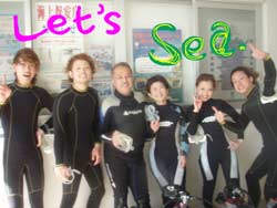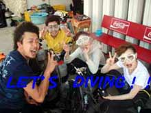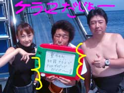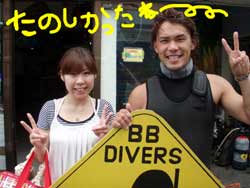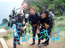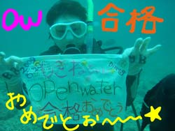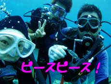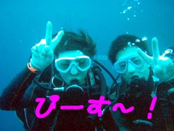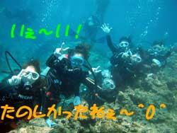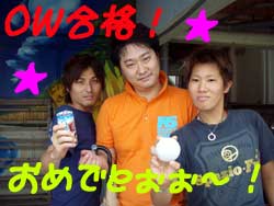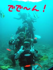 こんにちはーー!!今日はなんと!!新たにダイバーの誕生でーす♪今日ダイバーになったのは千秋にぃさんの紹介できてくれたしょうちゃーーん☆今日は学科を頑張りましたーー!!たくさん苦戦したけど・・・見事合格でーす!!!おめでとー♪今日は夕方からライブと言う事で海には入れなかったので次回は一緒に潜りましょうねー^−^楽しみに待ってまーす★ |