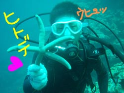 こんにちはーーー!!今日は何とっ!!新たにダイバーの誕生でーす★今日ダイバーになったのは魚屋さんで働いている天野くーん!!その名も店長でーーす!!ずーーっと魚屋の店長だと思っていたらただあだ名が店長ってだけでした^−^;まぁそんな事はおいといてOW合格おめでとー!!今日はスキルが残ってなかったのでたくさん水中を楽しんできました!!2本砂辺で潜ってその後真栄田岬にも行ってきましたよー♪バッチリ蒼の洞窟にも行ったし今日は1日水中を満喫しちゃいましたねー!!また沖縄に来た時は潜りに来て下さいねー!楽しみに待ってまーす!! |