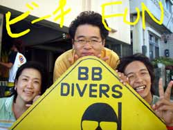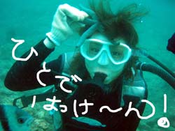 まいど〜ひろあきです!!今日も朝からポツポツ雨が降っている沖縄地方です。。。さてさて朝から体験ダイビングで遊びに来てくれたのは、BBの二階の「ちゃたん」で前働いていたせりちゃんのお姉ちゃんのきょうこちゃんがはるばる北海道から遊びに来てくれました☆ダイビングは初めてでしたがとても飲み込みが早くあっという間に水中へレッツゴーです☆寄って来る魚にニコニコ笑顔で餌付けをしてモニョモニョ感触のソフトコーラルもばっちし触ってきました!とっても上手だったきょうこちゃん、今度は是非是非ライセンス挑戦してみてね!また潜りましょう☆ |