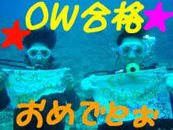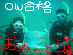 こんにちはー!!今日はなんとっ!!新たにダイバーが誕生しちゃいましたー!!今日ダイバーになったのは仲良し親子のいわちゃん&みーちゃんでーす!!おめでとー!!今日はスキルが残ってなかったので2本ともガッツリ遊んできましたー★ニモを見たり深場を泳ぎ回ったり写真もたくさん撮りましたねー^−^そしてそして2本目の最後には水中でOW合格のお祝いをしてきましたー!!また忘れないうちに潜りに来て下さいねー!!楽しみに待ってまーす♪ |