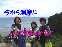 こんにちはー!!今日は真栄田岬で洞窟スノーケル!!遊びに来てくれたのは東京から来てくれたしかま君・ゆかちゃん・みほちゃん!!みんなスノーケルは初めてということでしたが3人とも上手に泳ぎ回ってましたーー!!洞窟の蒼すっごい綺麗でしたねーー^−^魚にエサをあげたりクマノミを見たり水中世界楽しんでもらえましたかー??次回は是非ダイビングにも挑戦してみてくださ−い!!楽しみに待ってまーす! |