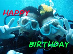 こんにちはー!!今日は真栄田岬で体験ダイビング!!遊びに来てくれたのは仲良しカップルけんくん&ゆきちゃーーん☆2人とも初ダイビングということで少し緊張気味でしたが洞窟に行ってキレイな蒼を見たり魚にエサをあげたり水中世界を満喫してきましたー^−^ダイビングの最後にはゆきちゃんがもうスグ誕生日と言うことで水中でお祝いをしてきましたーー♪おめでとー!!また2人で遊びに来て下さいねー!! |