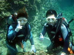 こんにちはー!!今日は真栄田岬で体験ダイビング★遊びに来てくれたのは横浜から来てくれたあっきー&りささーーん!りささんは初ダイビングで少し緊張ぎみでしたが慣れて来ると周りの魚を見たり余裕でしたねー^−^あっきーは1回やったことがあるということで最初からとても上手でしたー☆洞窟に行ってキレイな蒼を見たり魚にエサをあげたりクマノミを見たり楽しんでもらえましたかーー??次回は是非ライセンスに挑戦してみてくださーい^−^ |