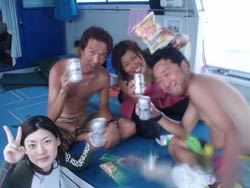 はいさい!ぎぶんです。 今日は、ナスビちゃんのガイドで弟・千秋と失恋・祥子と萌萌・よーことみんなで、慶良間に行ってきたよ。一本目、ナント!とんでもないハプニングが!!ぎぶんのサーフパンツが脱げてしまいてんやわんや!千秋くん爆笑しすぎてエアー0、いやぁ〜たいへんだった(==;) 二本目は潜って早々おっきなアオウミガメと遭遇!さらにマダラトビエイ!遠くにはジンベイザメがカジキマグロと対決するという光景まで!いやぁ絶景でした!よーこがカメに襲われるという楽しい事件もあったなぁ(^^) 三本目は・・・・寒かった。 そんなこんなの慶良間ツアー帰りはみんなでビール片手に花見状態で笑顔で帰宅。 やっぱりぎぶんと潜るとたのしいなぁ(祥子談) |