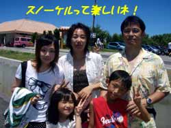 みなさ〜ん!夏をenjoyしてますか?さんぺーです☆今日は三重から素晴らしい家族が来てくれましたよ〜☆柳川さんファミリーで〜す★ママとルナちゃんが体験ダイビングに挑戦するとゆうことで、パパはシュノーケルで応援をしてくれました☆ママもルナちゃんも最初はちょっと緊張していたけれど、パパの温かい応援にも励まされ潜ることができましたね!水中写真の時もパパはいつも素潜りで海の中に来てくれて家族揃って記念の一枚を写すこともでき、ママもルナちゃんも笑顔で水中世界を楽しむことができました〜ダイビング最高ですね!!次回は砂辺の海でたくさんの珊瑚に囲まれながら泳ぎたいですね☆ゆうりちゃんもとっても楽しかったと余韻にひたってましたよ。南の島で、また素晴らしい家族に会える日を楽しみにしていま〜す! |