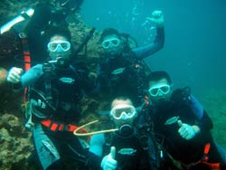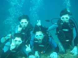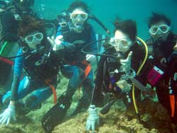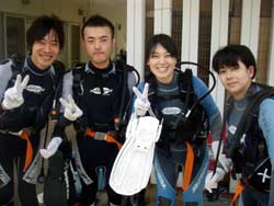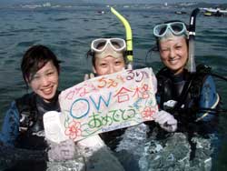 はいさ〜い!!ひろあきです。今日は新しいダイバーが誕生しました☆九州から遊びに来てくれた女の子三人組かなちゃん・ちえちゃん・るりちゃんです。初日から台風の影響で海が使えずプール講習からスタートでしたが、最初は水中のバランスとマスクスキルに手こずりましたが気合いでなんとかクリアしていきました。2日目もビーチポイントはNGだったのでボートでのダイビング☆初めての海の水中にニコニコ笑顔で楽しんでいました♪おかげでスキルは進まなかったけどね〜(笑)そしていよいよ最終日!!やっとビーチもうねりが落ち着きゆっくりスキルをやる事ができました!新しいスキルにも頑張って挑戦する3人。無事にクリアしていきいよいよラストダイブ!!最後は浮力の練習をしながら洞窟ダイブ☆夕方になりかけていたので洞窟の中はさらに真っ暗・・・。でも洞窟の出口は青〜く光っていました。そしていよいよ運命のラストスキル!!!嫌いだったマスククリアも上手に出来るようになりました。頑張ったもんね!そして合格祝い!!!オープンウオーターダイバー合格です!!!おめでと〜〜〜☆★☆★☆★☆★パフパフパフパフ〜〜〜★☆★☆台風の影響が出る中無事ライセンス取得できてよかったですね!!まだまだたっくさんの海があるのでこれからもダイビング続けてください^−^また逢えるのを楽しみにしていますよ〜☆ |