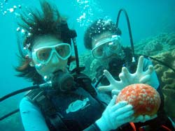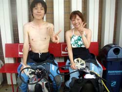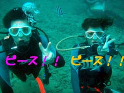 みなさーん!!夏休みは何をして過ごしますか?冷し中華が美味しい季節になりましたね☆ど〜も、さんぺーです!! ここ沖縄は南国ムードでいっぱいで〜す!今日体験ダイビングしに遊びに来てくれたのは、つかさ君と、かおるちゃんで〜す!初めてのダイビングとゆうこともあって最初は緊張気味でしたが、陸上での練習で徐々に緊張もほぐれてきたところで、楽しく海へ入りましたよ〜☆お魚にたくさん囲まれながらたくさん泳いでくれましたね!ニモを初めて見て感動しましたね〜★空を飛んでるような感じで珊瑚の上を泳いでいるときに、つかさ君はカメラを手にして写真もとることができましたね☆ダイビング楽しかったですね!また、沖縄の海で一緒にダイビングしようね☆南の島から次回2人に会える日を楽しみに待ってま〜す! |