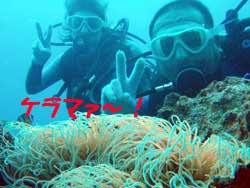 はいさーい!!今日は、ケラマでFUNダイビング&体験ダイビングでーすおがさん&ますださんが遊びに来てくれました!!朝からブルーハーツでのりのり気分でいざ慶良間に出港です☆1時間ほどのクルージングを楽しんだらポイントに到着です!!久し振りのダイビングと言う事で、のんびりと泳いでクマノミを見たり、ゴマモンガラに追いかけられたりしました!!!!!2本目は、一緒に潜ってサンゴに群れてるデバスズメダイを見たり、ニョロニョロのガーデンイールを見たり、ナマコで遊んだりしました!!最後はバブルリングを練習して慶良間を満喫しましたね!!また一緒に潜りましょうね〜☆ こんにちはー!なすびでーす!!今日は慶良間でおがさんと体験ダイビングでーす☆初ダイビングということで最初は少し緊張気味でしたが水中に入るとすぐに慣れてとても上手に泳いでくれましたーー♪残念ながらカメはボートの上からしか見れませんでしたがクマノミやイカの群れなどキレイな魚がたくさんいましたねー!!ナマコで遊んだりスノーケルをしたり楽しんでもらえましたかーー??次回は家族みんなであそびにきてくださ−い^−^ |