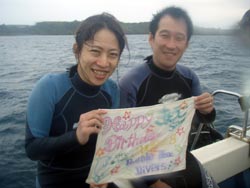 今日は台風接近中!!しかし潜れる海はありますよ〜♪そんな中潜りに来てくれたのは仲良し夫婦☆ともくん&きょんちゃんでぇす(0^^0) 2人はダイビングの経験が数回あるのでもうベテラン体験ダイバーさん♪少しだけ練習して楽々、水中世界へ!!中に入るととっても綺麗な砂地が広がっていてナマコがたくさん(><) プニュプニュ触って変な感触でしたね!!白い砂地の先には硬いサンゴがあり、サンゴに棲むカラフルなお魚さんがいっぱい☆まるで龍宮城に行ったみたいな気分でとっても癒されましたね(^0^) そしてラストはBBよりサプライズ★8月6日はきょんちゃんの誕生日!!なので水中バースデー祝い〜(0^^0) いくつになってもお祝い事は嬉しいですね♪きょんちゃん本当におめでとう!!またいつでも沖縄の蒼い海に遊びに来てね!!次こそ蒼の洞窟に行きましょう♪ |