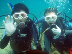 はーい!!どーもー!今日も元気なワンタンでーす!!今日は〜OW講習最終日でビーチに行ってきました〜!!三日間がんばってくれたのが〜チエちゃーんです!!二日間は重森氏と一緒に様々な苦難??を笑いながら乗り越えてきました!今日は水中をのんびりと泳いで、ちょっとフィンピボットの練習もしたね(笑)。二本目にはカメラをバシバシ撮りながら〜やってきました最終試験!項目は〜レギュレータークリア!見事に〜キレイにできて合格!!おめでとうございまーす!!また忘れないうちに潜ってねー!待ってるよー! |