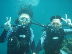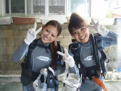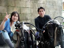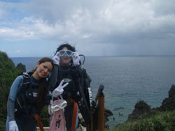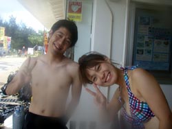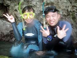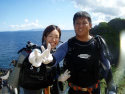 こんにちはーー!!今日か午後からも真栄田岬で体験ダイビングーーー^−^遊びに来てくれたのは福岡県から来てくれたゆきちゃん&まささん!!2人共初ダイビングということで少し緊張気味でしたが少し練習するとすぐ慣れてとても上手に泳いでましたねー★魚にエサをあげたりクマノミを見たり、蒼の洞窟にも行ってきちゃいましたー♪水中世界メチャクチャきれいでしたねー!!また沖縄に来た時は2人でダイビングしにきてくださーい!!楽しみにまってまーす☆ |