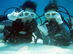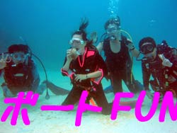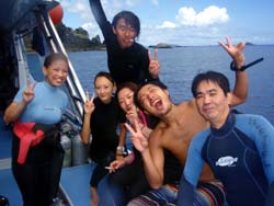 はいさーい!!今日はケラマでボート体験ダイビングで−す★遊びに来てくれたのはヒロシさんとナミコさんでーす☆少し最初はドキドキしていましたが、段々と水中にも慣れていき、サンゴの所を泳いでいる魚を見たり、ナマコで遊んでみたり砂地で寝転がって写真を撮ったりと沖縄のキレイな海を満喫できましたか??2本目になると随分と余裕も出てきて、お魚たちもたくさん見れましたね☆またみんなで潜りましょうね〜☆ライセンスをとるともっとたくさん泳げたりして楽しいですよ☆また沖縄に遊びに来て下さいね〜!!南の島で待ってますよ〜♪♪♪ |