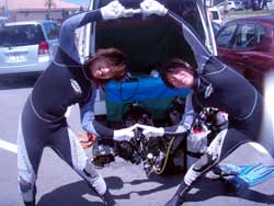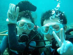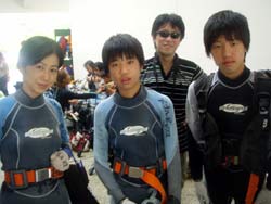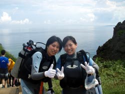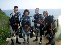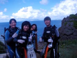 はーい!!今日は真栄田岬で〜体験ダイビングゥー!メンバーは木村さんご一行様でーす!!最初はやっぱりドキドキしながら〜練習!!そして海の中へ・・・。みんな潜る事ができました!!洞窟へ・・・向かっていきましたよー!その途中でいろんなトラブルがありながら(笑)無事に着く事が出来ました〜!最後には〜1人で泳げる人もいましたねー!また来て下さいね!! |