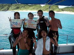 はいさーい☆はいたーい★ひろあきです!今日も元気に世界に誇る海ケ・ラ・マ!に行ってきました〜!しかも今日は海況がよかったのでヤカビ&久場島まで足を伸ばして行ってきましたよー!!今日のメンバーはワンタンチームは吉岡さん&藤岡さん・沖縄在住のゆみちゃん★ひろあきチームはお久し振りのチーム永Pのすみちゃん・まっきー・ケムケム・まーくん・ふーちゃん・さっちゃん・でした★しかも今日はお祝いオールお祝いダイブ!一本目ではまっきーの101本目!?二本目ではケムケム&さっちゃんの100ダイブ★そして最後はふーちゃんの50本!!!!いや〜みんなどんどん上手になっていきます。こんな記念ダイブで一緒に潜れて僕も嬉しかったです^−^これからもたくさんの素敵な海を見てくださいね! |