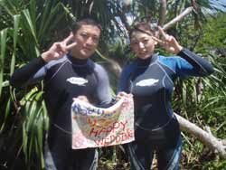 初めてのダイビングに挑戦してくれたのはまさしくんとまどかちゃんの仲良しカップルです!今回はダイビングとスノーケルのセットコースでのお申込みでまずは砂辺で体験ダイビング!最初は緊張していたまどかさんでしたが練習を始めるととっても上手に水中にエントリーできました。寄って来る魚に餌付けをしてモニョモニョのソフトコーラルを触ったり・・・。そして一昨日が誕生日だったまさしくんをサプライズで水中お祝い☆★☆★まさしくん誕生日おめでと〜〜!!!そして午後からは洞窟のマジシャンことサンペーさんが担当しました! はーい東洋のマジシャンのさんぺーでーす!!真栄田岬に場所を移動し洞窟スノーケルへ行ってきましたよ〜★たくさんの魚を見ながらのんびり泳ぎました!!洞窟でみた青の輝きはどうでしたか?感動と驚きでいっぱいでしたね!!ツバメウオに2人はビックリしたり、たくさんの魚にエサをあげながら泳ぎましたね☆また沖縄の海で泳ごうね!南の島から2人に会える日を楽しみにまってまーす☆ |