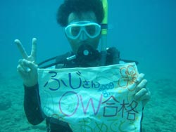 こんにちはーー!!今日はビーチFUN&OWラストーーー☆ファンダイビングのにしおっちと今日見事めでたくダイバーになったふじさーーーん♪おめでとーございまぁす^−^ふじさんは体験ダイビングもしたことなく初ダイビングということでしたが初日からスイスイ講習が進んでましたねーー☆最終日の今日はスキルが残ってなかったので砂辺をひろ〜く泳ぎ回ってのんびり水中を楽しんで遊んできましたーー☆にしおっちの大好物のウミウシやアカメハゼなど見てきましたねー!!2本目はOWラストと言う事でにしおっちと3人で水中でふじさんのOW合格のお祝いをしてきましたーー★おめでとーーー!!また体が感覚を覚えてるうちに遊びに来て下さいねーー!また一緒に潜れるの楽しみに待ってまーす!!にしおっちも残り少ないので沖縄ライフ楽しんでねーー^−^ |