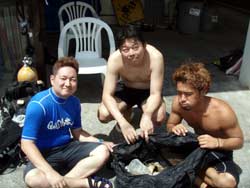 はいさい!ひろあきです!今日は前回オープンウオーター講習で遊びに来てくれたサウスさんが今度はアドバンス講習で来てくれました。そして純うちなんちゅーの井口さんも久し振りにファンダイブで参加してくれました。今回は中性浮力の練習とナチュラリスト☆写真の通りナチュラリストではゴミ拾いをしたのですがメッシュバックいっぱいになるほどゴミが落ちていました・・・。でもなんかいい事したなぁ〜って気がしましたね。これからも海を綺麗に!!サウスさんアドバンス合格おめでと〜ございます☆井口さんまたふらっと遊びに来てくださいね〜^−^ |