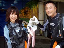 はいさーい!!元気なさんぺーです☆今日も青空と青い海がとっても気持ちいい真栄田岬に体験ダイビングに来てくれたのは、かっちゃんと、りこちゃんです☆2人は幸せいっぱいの新婚旅行中で、一緒に蒼の洞窟まで行ってきました!!2人とも海の中でも落ちついていて楽しく泳ぎました☆洞窟の中でみた青の世界はとっても綺麗でリュウキュウハタンポの群れと洞窟の青さがシルエットになって感動的でした!!海の中でサプライズ記念になりましたか?思い出にハンカチしまっておいて下さいね☆また沖縄で一緒にダイビングしようね〜!南の島から次回会える日をお待ちしていま〜す! |