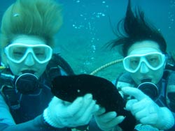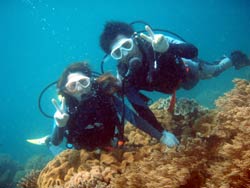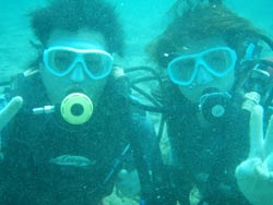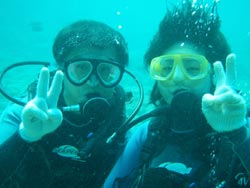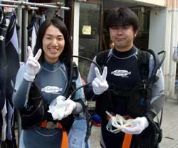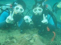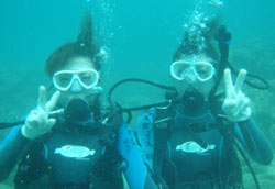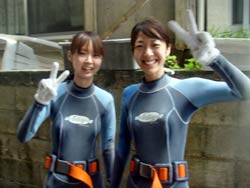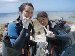 はいさ〜い★今日はしじみが名産の島根県からなっちゃん&しのちゃんが遊びに来てくれました。2人とも始めてのダイビングで最初はもの凄くドキドキ・・・。でも穏やかな水面で練習するとあっという間に水中呼吸に慣れてスイスイ水中を突き進んでいきました。今回は特上スペシャルダイビングだったのでフワフワのソフトコーラルのお花畑の上をのんびり泳ぎました☆今度は是非ライセンス取得してください!! |
