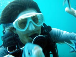 お昼からはとっても仲良しカップルさん♪しょうクン&みほチャンが体験ダイビングをしに遊びに来てくれましたぁ(^^) みほチャンは1度ダイビングの経験あり☆しょうクンは初めてのダイビング!!でもそんなのは感じないくらい上手に水中世界へエントリ〜♪水中に入ると2人ともニコニコとっても素敵な笑顔(0^^0) たくさん寄ってくるお魚に餌をあげている時も自由に空を飛ぶように泳ぐ時も2人は常に笑顔☆とっても可愛い海のアイドル「ニモ」に会いに行ってテンションも高々↑↑プニュプニュの柔らかサンゴを触って黒〜いプニュプニュのナマコを発見!!なかなか触る機会ってないので渡してみると・・・みほちゃん完全拒否!!私を盾にしてまでナマコから逃れようとしていました(^^;)笑 水中にはいっぱいいろんな生き物がいてとっても楽しいでしょ??次はのんび〜り遊びに来てね♪ |