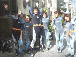 まいど〜ひろあきです!去年も遊びに遊びに来てくれたゆういちさんとまさのりさんが会社の同僚を連れて遊びに来てくれました^−^ミサさん&アキコさん&リョウタロウさん&ミキコサンの総勢6名です★今日の砂辺はベタ凪でとてもエントリーしやすい海でした。みんなで水中8メートルから水面を見上げてみたりナマコで一発芸をしたり動画をとって遊んだりワイワイ楽しんできました!またみんなで遊びに来てくださいね!待ってま〜す★ |