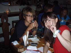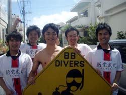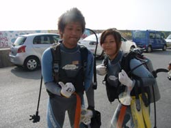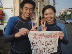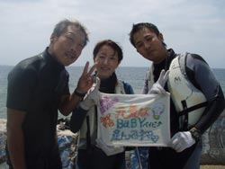 はいさ〜いひろあきです!今日は新婚旅行で沖縄に遊びに来てくれたしんごさんとちかさんのお2人です★最初は若干ビビリ気味のお2人でしたが水中に入ると意外に落ち着いていて魚に餌付けをしたり、ニモをみたりソフトコーラルをみたり水中を満喫しましたね。それからBB特製のハンカチをプレゼント!!これには2人もびっくりしてくれました^−^帰りに少し酔ってしまったけどダイビング楽しんでくれたみたいでよかったです★また沖縄に来た時は是非遊びに来てくださいね!! |