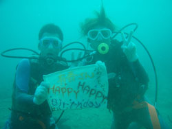 しげちゃんです♪今日の体験ダイビングはオダさんとエカさん!!!砂辺でたっぷりと遊んできましたよーーー★ ダイビング初のお2人でしたが上手に潜ってくれましたね♪ 魚にえさをあげてみたり、可愛いクマノミ「ニモ」と遊んだり♪ 水中のお花畑もとっても綺麗でしたね♪最後にはサプライズの 水中ハッピーバースデー!! エカさん♪ おめでとうーーーー☆ 今度は「青の洞窟」ダイビングにも挑戦してみましょうねーーー♪ |
