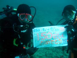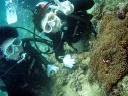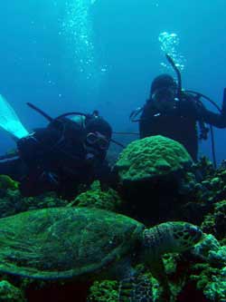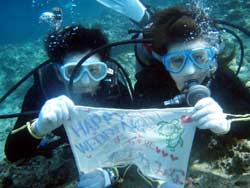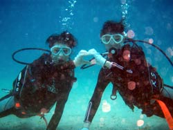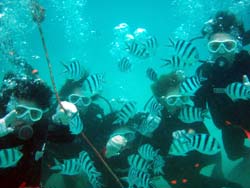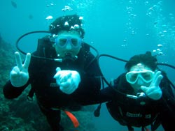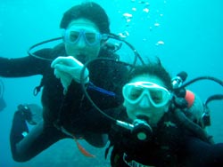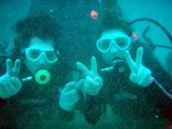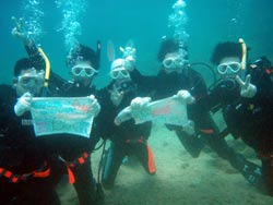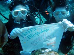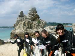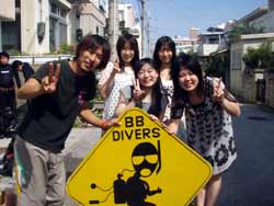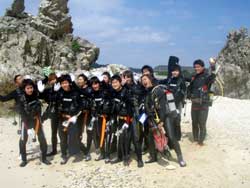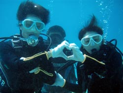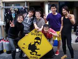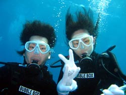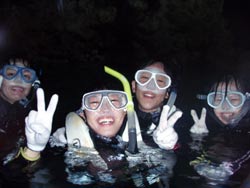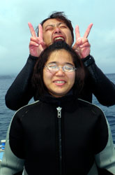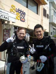 はーい!どーもワンタンでーす!!今日は15:00〜体験ダイビングを真栄田岬でやってきましたー!!参加してくれたのは〜ひろしさんとまゆみさんでーす!!とっても仲が良かったで〜す(笑)。ちょっと最初は緊張していましたが・・・あの青い光を洞窟で見たときの顔はほころんでいましたねー!!だんだん慣れてくると楽しいですよね!!帰り道にはニモの親戚のクマノミと遊んだり〜、サンゴも観察してきました!!最後にはりょーけんの一発芸の泡のリングも決まり楽しかったですよね!!今度はケラマ諸島に行ってカメでもみましょうね!!また来年もお待ちしてますよー!! |