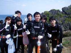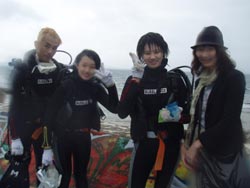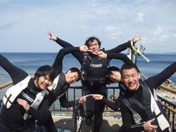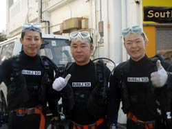 はーいどーも!!わんたんでーす!!今日は体験ダイビングで〜す★泉さ〜ん!!高山さ〜ん!!坂口さ〜んです!!みなさん自衛官と言うことで練習もそこそこにバッチリでしたね〜!!高山さんなんか耳抜き3年マイスターと言うことで・・・最初はうたがっていましたが・・・本当にうまかったです!うたがってすみません!!砂辺の海もソフトコーラルとかカクレクマノミ、でかいナマコ、泡のリングけっこうキレイでしたよね〜☆砂辺も〜!次回は必ず穏やかな海と綺麗な青を準備して待ってまーす!!泉さんもまたよかったら一緒に潜って酒でも飲みましょうね〜☆ |