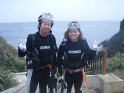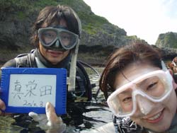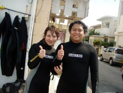 やっふー!りょーけんでっす!!今日は朝から真栄田で体験ダイビングをやってきましたー。本日一発目はな、なんと新婚旅行でやってきた月山さん夫婦まさはるさんとくみさん。今回はDコースということでたっぷりと潜ってきましたよ〜!!一本目は軽く練習感覚でクマノミを見に行って餌付けをしたり、水中で自分で泳ぐ感覚を体験したりしましたね。2本目はいよいよ洞窟へ行ってきました。一本を練習で潜っただけに、すごいスムーズに潜りだしましたね。洞窟の青さに驚いたり、帰りに餌付けした時の魚の多さに驚いたりと驚くことがたくさんありましたね。最後に一発芸のバブルリングも無事成功させることができました。そしてそしてご結婚おめでとうございます(0^^0) やっと帰ってきたまさはるさんと楽しい新婚生活を送って下さいね☆また沖縄に来る機会があったら今度はライセンス講習で会いましょう |