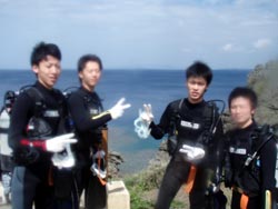 やっふ〜!りょーけんでっす!!午前中の体験に引き続き午後も真栄田岬の青の洞窟へ体験ダイビングしてきました〜!!今回のメンバーは卒業旅行で沖縄にノープランでやって来た山田くん!西垣くん!河野くん!加藤くん!の4名!!全員ダイビング初体験と言う事で張り切っていってきました〜!!陸上の練習の段階からみんな海に早く入りたいオーラがでてましたね(笑)水中に入ってからは最初は慣れない水中でバランスが取れなくてちょっとあたふたしてましたが、途中からは慣れたようで問題なく進みましたね!洞窟の中では入り口の青さをじっくりと鑑賞していましたね!クマノミを見ている時魚たちに指を噛まれて驚いてたね!次に潜る機会があれば店の前の砂辺の海でニモや柔らかいサンゴのお花畑を見に行きましょう!! |