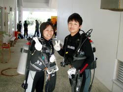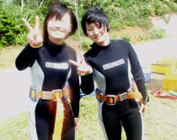 13:00洞窟体験ダイビングに参加してくれたのは 関西から遊びに来てくれた ともみちゃんとみきちゃんです。とっても元気で可愛い女の子でした。耳抜きの時や陸での練習の時は少しドキドキしていたようでしたが 水中練習では 水を得た魚のようになっていました。途中少し鼻から水を飲んでビックリしていましたが 海の中の青さや魚に我を忘れ追いかけまわしていた二人でした。青い魚や顔より大きな魚が近くまで遊びに来てくれたり クマノミの家にお邪魔したりなどなど 途中イカも発見しましたね。今度はライセンス取得に沖縄に遊びに来るのもいいと思うよ。必ず また 待ってるからね。あんまり 詰め込んだ旅行はしないようにね。辛い時はあの水中の風景を思い出して下さいね。 |