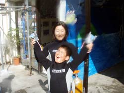 今日はとっても可愛い男の子☆ハルマくんが遊びに来てくれましたぁ(0^^0) ダイビングは初めて♪最初は緊張していたみたいだけど大好きなお魚さん達を見たらニコニコの笑顔☆飛行機にいっぱい乗ってると言うハルマは耳抜きもとっても上手!!いっぱい泳いでお魚さんにごはんをあげるともの凄い勢いで食いついてきたね!!お魚さんにもちゃんと歯があったでしょ??ニモのお家ではプニュプニュのイソギンチャクを触ってみたりヒトデや色んな種類のナマコも興味深々でいっぱい触りました!!海から上がってからの磯遊びもとっても楽しかったね!!今度は弟君も大きくなって温かい海でみんなで遊ぼうね♪成長したハルマに会うのを楽しみにしてるよ〜(^0^) |