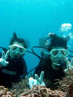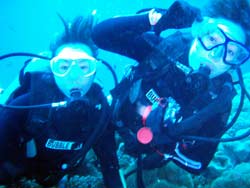今日は朝一からダイビングとスノーケルのスペシャルセットコースで遊びに来てくれましたぁ♪約半年ぶりに潜るトモコさん&ダイビング初めてのマリさん(^0^) ライセンスを持っているトモコさんはさすが☆だいぶ余裕もありお魚さんとたくさん戯れてきました(^^) マリさんはものすご〜く緊張していて深場に行くと必死?!でもお魚さんを見るとにっこり笑顔(0^^0) 余裕が出てきたかな〜??と思うとやっぱり必死(><) の繰り返しでしたね★笑 でもしっかり海のアイドル「ニモ」に会って柔らか〜いサンゴやナマコを触ったりして遊びました!!そしてスノーケルではヒトデを触ったりいろんな種類のお魚やサンゴを観察☆やわらかサンゴのお花畑はとってもキレイだったでしょ??次は水中でお花畑を見に行きましょうね!!太陽の日差しも入って綺麗な時にいっぱい写真も撮りましょう♪マリさんはまた体験でも頑張って講習でもどちらでも来て下さいね!!トモコさんはリベンジ戦お待ちしてます!! |