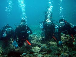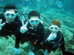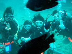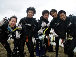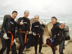 はーいどぉーも!ワンタンでぇ〜す☆今日は砂辺で体験ダイビングをしてきましたぁ〜^▽^メンバーは〜広島から来てくれた〜ダイスケさん・タツヤさん・アツヒロさんでぇーーす☆陸で説明している時は〜ちょっと緊張ぎみでしたが〜水面で練習をしている内に段々慣れて行きましたねぇー♪ちょっと海は揺れていましたが・・・それをなんなくクリアをして〜水中に入ることができましたぁーー。中では泳ぐためのコツをちょっとやっていざ出発★☆泳ぐのもみんなうまかった〜!!!!ビックリ!!!!ニモの家にもお邪魔してナマコも遊んで最後エサをあげて魚の貪欲さにビックリしたでしょう(笑)次は絶対洞窟にいこーーね。まってるよぉ〜!! |