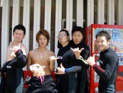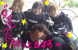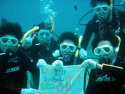 まいど〜ひろあきです!!今日は天気もよくて風がそよそよ気持ちいい一日でした。そんな中真栄田岬で体験ダイビングで初めてダイビングをする4人と一緒に潜ってきましたよ〜^−^の岩ちゃん・のぶ・ゆうた・くりちゃん4人チーム「糞」です!(笑)午前中は穏やかだった海も午後になるにつれてだんだんうねりが入ってきて、クローズになる感じだったので陸上の練習もそこそこにいざ出発!!水面はゆらゆら揺れていたけれど中は最高に綺麗な透明度☆☆しかも太陽の光がマックスに入り込んでキラキラ光っていました☆洞窟の中も貸切状態で楽しめましたよ〜!!今度はライセンス講習でもっとダイビングについて勉強してみよー^−^きっと楽しさ倍増です☆また遊びに来てね〜!! |