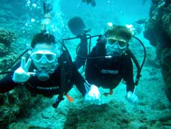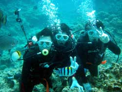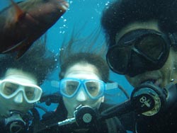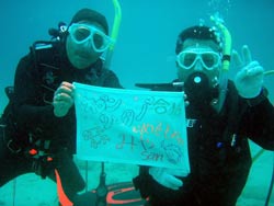 はーいど〜もワンタンで〜す!!今日13:00から体験ダイビングやってくれたのは仲良し家族さ〜んです!!メンバーはお父さん&まさとくん&はなみちゃんです!!最初はドキドキしていたのも〜水面で練習しているうちにだんだん慣れてきた様子☆笑 すごーく引いていたのでまたここから歩き・・・海にダイブしてエントリ〜!!プカプカ浮くから楽しいでしょー!!さ!耳抜きをしながら頑張って潜って!ニモに会って〜みんなKissをされて〜泳いで魚にご飯をあげたり最後はワンタンの一発芸!!うまくいって良かった〜!!また来年遊びに来たら顔を出してね〜!!沖縄で待ってるよ〜!! |