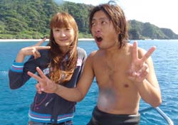 はいさーい!!今日は、ゴリチョことゴリラチョップで体験ダイビングでした★遊びに来てくれたのは、たかしさんとまゆみさんのお二人です!!最初は少し緊張気味でしたが、だんだんと水中世界にも慣れていって、みんなで一緒にクマノミを見たり魚にエサをあげたり、魚に囲まれながら写真を撮ったり、ナマコやヒトデなんかもいましたね☆そして帰り道なんかでは、大きな貝も見つけちゃいました☆とっても上手だったお二人、明日も肺の使い方を思い出しながら、ケラマの海を満喫してきて下さいね〜♪♪♪ |