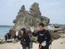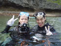 ど〜も〜!りょーけんでっす!!今日は真栄田岬に行ってきました!太陽は出てこなかったけど海の中は綺麗でしたよ。今回体験ダイビングに来てくれたのは千葉県からお越しのトモヒトさんとめぐみさんの2名でした!!トモヒトさんは今回で5回目の体験ダイビングめぐみさんは逆に初めてのダイビングと言う事で今日も張り切っていってきました。水面での練習中めぐみさんがちょっと緊張した様子でしたが潜ってしまえば初めての水中にずっと笑顔を浮かべてました!トモヒトさんはもう慣れたもので、自分からどんどん泳いでましたね。洞窟の青さをじっくり鑑賞して、クマノミを見て、イソギンチャクに素手で触ったりもしましたね。魚達に餌付けをしてる時はずっと魚達に囲まれてました。最後にバブルリングも成功して楽しいダイビングでしたね。次は6月末にライセンス講習で会いましょう!! |