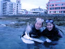 はーいどーもワンタンです!!今日は砂辺で体験ダイビングをしてきました〜!!メンバ〜はいつも来てくれているゆきちゃんと〜お友達のなつきさんで〜す♪最初練習している時はなかなか耳抜きが出来なかったけど・・・練習を重ねた結果!見事に出来るようになったねー!!あれはなんか俺も嬉しかったよー☆笑 そして潜ってから魚にご飯をあげて〜ちょっと泳いで〜カクレクマノミ「ニモ」に会ってきました〜(0^^0) 可愛かったね〜!!最後は一発芸のバブルリングも決まり〜良かった〜!!明日はケラマだね〜!!楽しんで行こうね!!果たしてカメさんには会えるかな?! |