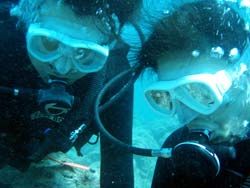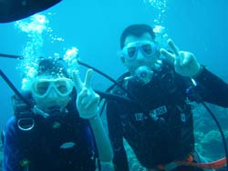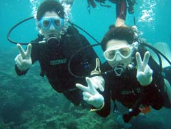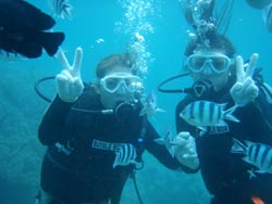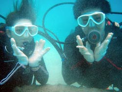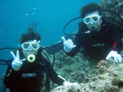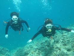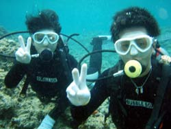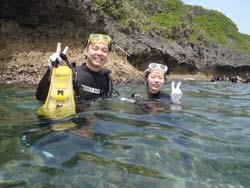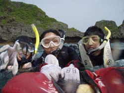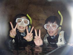 こんにちはー!!今日はマエダ岬で体験ダイビング〜♪セットコースと言う事でまず1本目はダイビングをして来ました!!二人とも初ダイビングと言う事で緊張気味でしたが最後は慣れて魚にエサをあげたり水中を散歩してきました―! はーい!!りょーけんでっす!ダイビングの後はスノーケルですよ〜!2人ともダイビング後なのでとっても上手に泳ぎましたよ。目の前に近寄ってくる魚達と戯れながら洞窟へ・・・。一番青い所で記念撮影をして入り口のところでクマノミを見てましたね。最後にバブルリングを成功させてスノーケル終了!!また沖縄に来る機会があったら次はダイビングで洞窟まで行きましょうね。 |