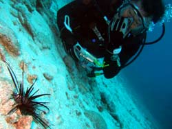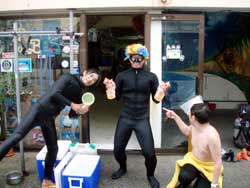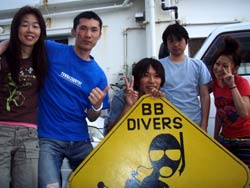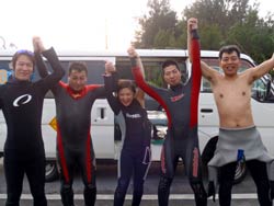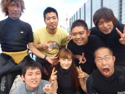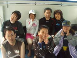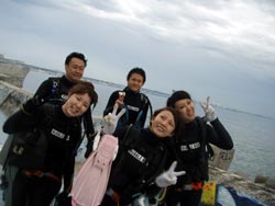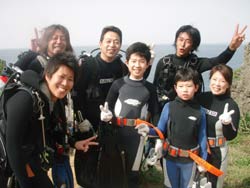 はーい!どーもワンタンでーす☆今日はなんと辺戸岬までファンダイビングに行ってきましたよ〜!!メンバーは〜千秋さん!パキさ〜ん!よしく〜ん!ゆみさ〜ん!シーサー!ゴリさ〜んでーす!!POINTは二神岩と辺戸ドームです☆二神岩の方は、二つの大きな岩があるPOINTで〜キンギョハナダイやカスミチョウチョウウオ、ウミウシ各種もちらほらと・・・結構透明度も良くてサイコーでしたね〜☆1本終わってからはーお昼休憩!!昼寝したり〜、飛び込んで遊んでみたり〜、ケガしてみたり〜!(笑)2本目のドームでは、やっぱり迫力抜群!!ちょっとドキドキしながら、ドームの中へ!!目のないコオロギや、ゆみさんのような、すべすべ肌の岩だったり(笑)帰る時は、目の覚めるような蒼さがここでお出迎えしてくれました〜☆帰りにはコンビニを3回くらい寄って酒盛り(笑)ビーチパーティーみたいであー楽しかった☆また一緒にいきましょうね〜☆ |