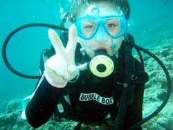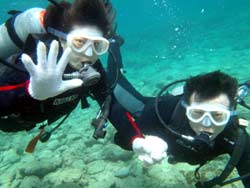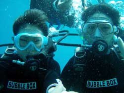 はいさーい!!今日は、お店の前の海砂辺で体験ダイビングです☆遊びに来てくれたのは、ナナミちゃん&マキちゃんのお二人です☆二人とも初めてという事で少し緊張気味でしたが、だんだんと水中にも慣れていって、魚にエサをあげたり、ニモを見に行ったり、魚に囲まれながら写真を撮ったりして遊びましたね☆バブルリングも綺麗だったでしょ??また沖縄に遊びにきてくださいね〜☆南の島で待ってますよ〜♪♪♪ |