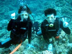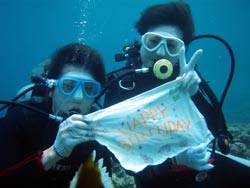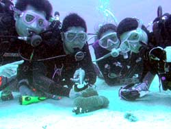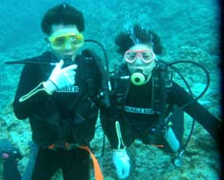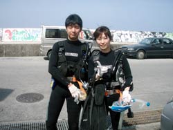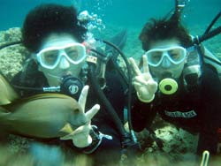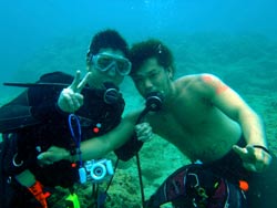 はいはーい!!どうも海坊主ことりょーけんでっす!今日は真栄田で体験ダイビングですよ〜。今回のゲストは新婚旅行中のケンザブロウさんとミワコさん!!途中で道に迷って到着が遅れるなんて事がありましたが、張り切って出発しましたよ〜!!最初は初めてのダイビングに緊張して力んでましたが、たくさんの魚達に出迎えられて段々リラックスしてきましたね。洞窟に入るとだんだん暗くなる洞窟にまた緊張した様子でしたが、入り口の青を見ると手を叩いて感動してましたね。帰り道ではクマノミを見たり魚に餌付けをしましたね。最後にお店からのプレゼントで水中で新婚お祝い!!これからも仲良く幸せになってくださいね。また沖縄に来る機会があったら今度はお店の前の砂辺の海で潜りましょうね〜 |